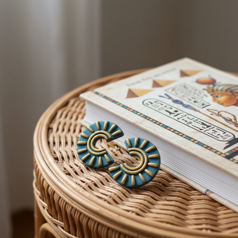 Nuestros pendientes arcilla artesanales modelo Cleopatra son una pieza de inspiración histórica que evoca el lujo y el misticismo del antiguo Egipto. Estos accesorios están diseñados en formato botón para ir pegados a la oreja, combinando una paleta de colores profundos con destellos dorados.